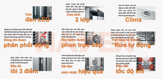 - Hiệu suất: Phân phối đồng đều các luồng không khí nóng và mát để luôn đảm bảo mang lại kết quả hoàn hảo nhất. Thiết bị còn cho phép kết hợp nấu cùng lúc nhiều món ăn tùy theo sự sáng tạo của đầu bếp mà không bị lẫn mùi.