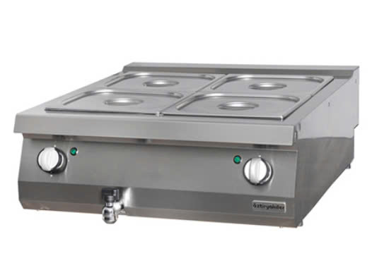 - Quầy giữ nóng có 2 dạng: thiết kế kiểu khay topping và dạng nồi hâm nóng. Những dạng quầy này đều hoạt động theo nguyên lý làm nóng thức ăn bằng hơi nước. Trong các quầy giữ nóng này, các khay đựng thức ăn được đặt trong các ngăn chứa nước nóng. Nước được làm nóng bởi các thanh điện trở bên dưới, lúc này hơi nước nóng sẽ bao quanh các khay thức ăn, giữ cho nhiệt độ của thức ăn luôn ổn định. Trên thân quầy có lắp đặt bảng điều khiển giúp người dùng dễ dàng kiểm soát nhiệt độ.