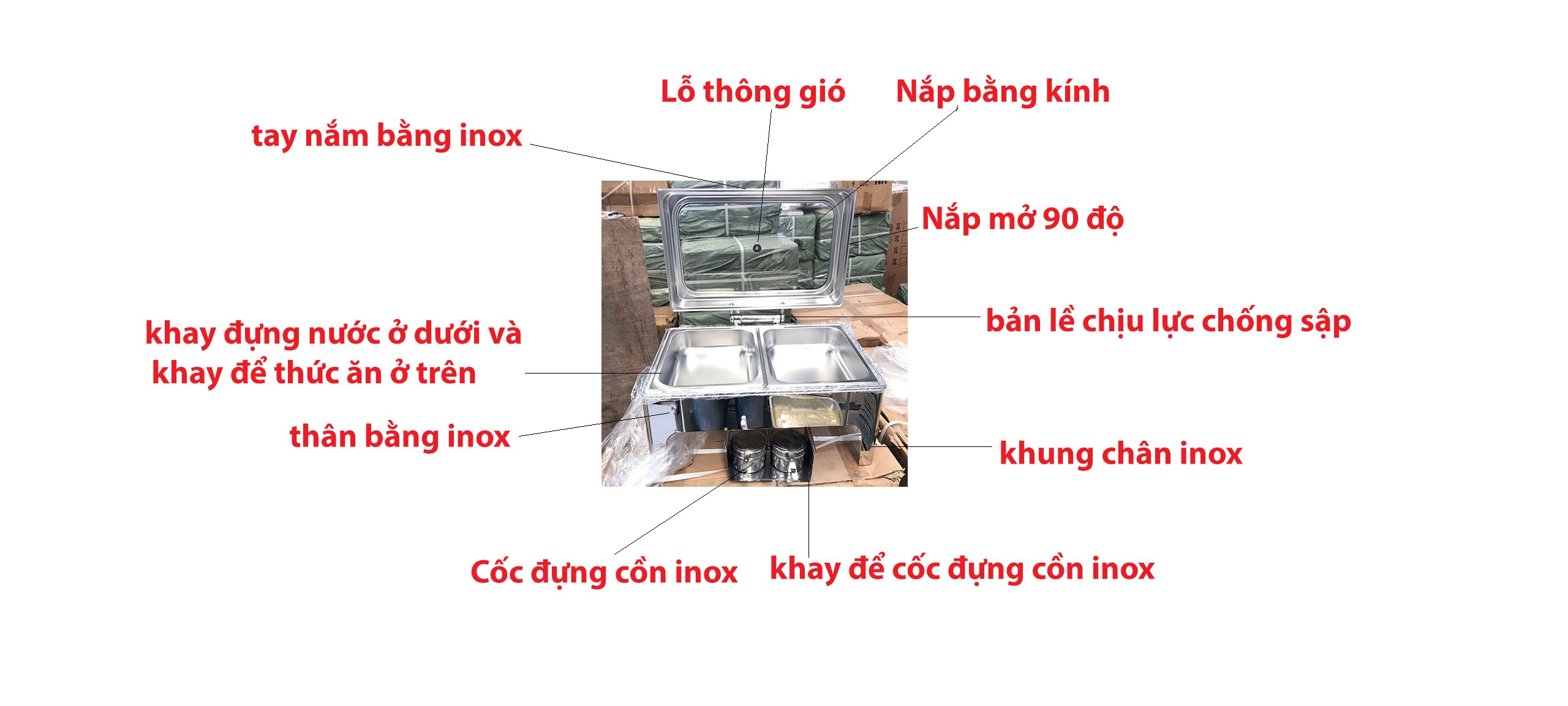 Nồi hâm buffet chữ nhật nắp kiếng gắn trục thủy lực được thiết kế lắp ráp từ nhiều bộ phận khác nhau. Gồm thân nồi, khay đựng nước, khay đựng thức ăn, 02 hũ đựng cồn, bảng điện điều chỉnh nhiệt độ